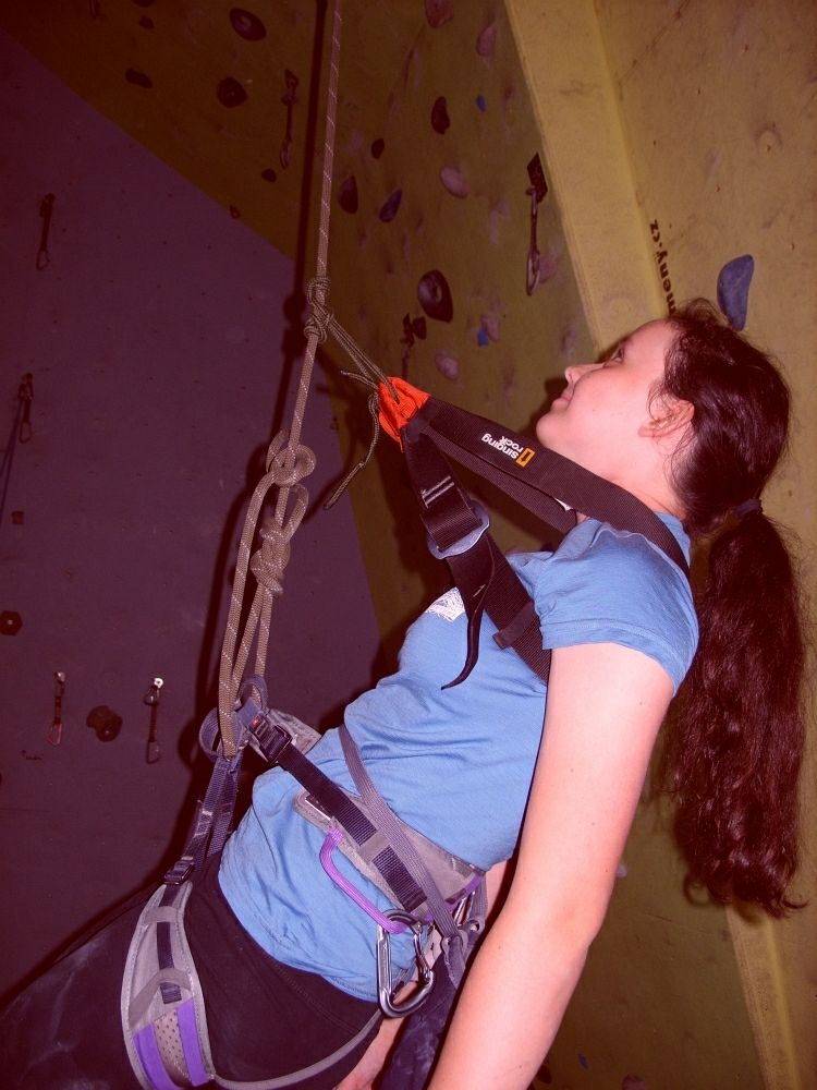na prvním velkém obrázku je špatně snad úplně všechno. ošklivým nesrovnaným osmičkovým uzlem počínaje, přes více než metrový podivně zašmodrchaný a překážející zbývající konec lana, po prsák evidentně neseřízený na velikost hrudníku. lidová tvořivost s prusíkem (prodlužujícím prsák a vytvářející ohromný překážející trojúhelník před zvláštním způsobem navázání týraným děvčetem je jen třešničkou na dortu.