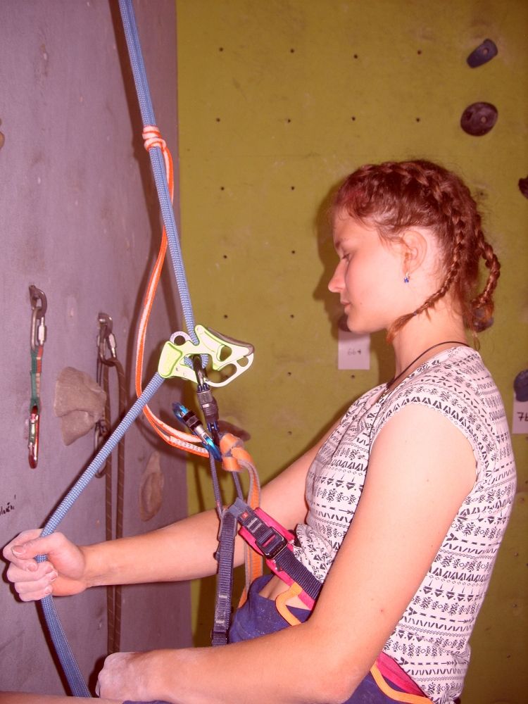 A k onomu požívání prusíku při slanění ještě poznámka. A sice jak se zachovat v případě zablokování slanovací brzdy hlavně v případě dodržení metodiky se smyčkou a prusíkem. (Možnost např. u zablokování kyblíku nevhodným lanem či zablokování osmy. Tenhle případ se nám konkretně stal při slaňování, naštěstí bez metodiky, místo prusíku s kontrolním jištěním jističe pod skálou. Navíc cca 1m nad zemí, což bylo lehce zvládnuto. Ale v půlce slanění nevím).Snad by nějakým vylepšením mohlo byt ono procvaknutí karabinou, kde by samovolé uvolnění osmy bylo obtížnější viz (https://www.lezec.cz/clanky.php?key=14646). Ono bybylo dobré ten průběh slanování s prusíkem uvést někde na videu. Málo se použíévá, jak je možno na skalách vidět běžně.