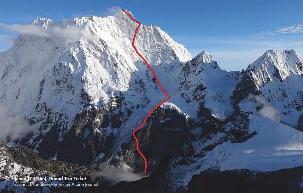 Jannu (7 710 m) prvovýstup Round Trip Ticket (2 700 m, M7 AI5+ A0), částečně nová cesta severní stěnou a severozápadním hřebenem Jannu, Kangchenjunga Himal, Nepál, Matt Cornell, Alan Rousseau a Jackson Marvell (USA), 7. až 12. října 2023. Sestup cestou.