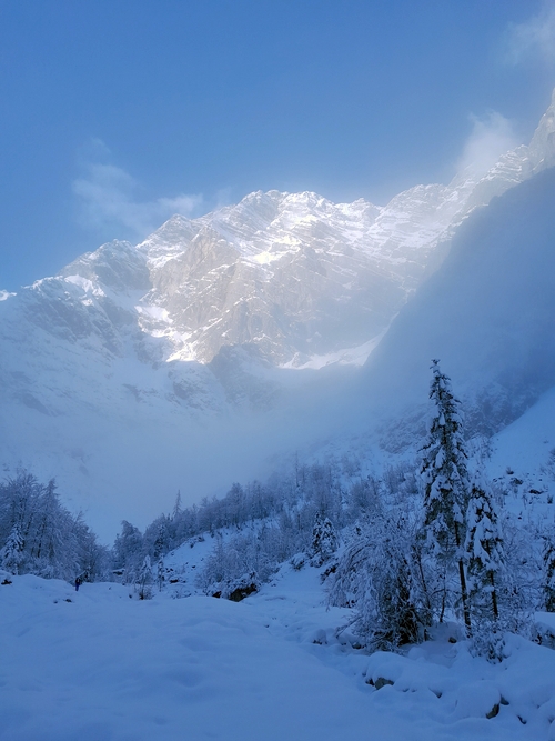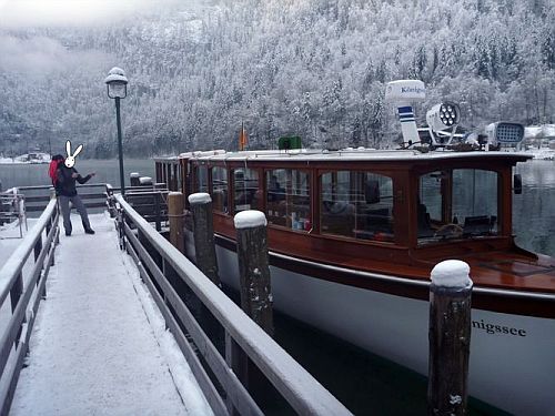 První loďkou do St. Bartholomä v 9.15. Cestou místní kaninchen vyvolává ozvěnu a sugestivně popisuje východní stěnu Watzmannu, jež se tyčí kousek nad jezerem a která má – nastojte – na svědomí více životů než pověstný Eiger Mordwand (aby taky ne, při tom provozu, co v ní každé léto bývá). Co na tom, že viditelnost je jen pár desítek metrů. Všichni jedinci Oryctolagus cuniculus ssp. japonicus, kteří zaplnili plavidlo, tají dech a zuřivě fotografují mlhu ve směru, kterým leží tenhleten óstwand. Následuje vylodění v 10.20 na farmě starýho Bartoloměje. Bob s Bobkem nasazují ostré rekreační tempo a nebýt ramlice z infocentra, která jim v bílé tmě ukázala správný přístup ke stěně, možná kolem jezera krouží dodnes. Za to jsou podrobeni výslechu, co že tam jdou dělat. Odpovědí je lehce šokována. Stěna je prý v zimě nebezpečná (no jo), skoro se neleze (to není úplně pravda), letos tam rozhodně ještě nikdo nebyl (to se ukáže být pravdou) a ona by do toho nevlezla ani za doprovodu našich ochlupených hrdinů (o což se ji, ehm, nikdo neprosil).