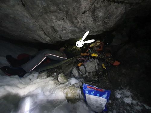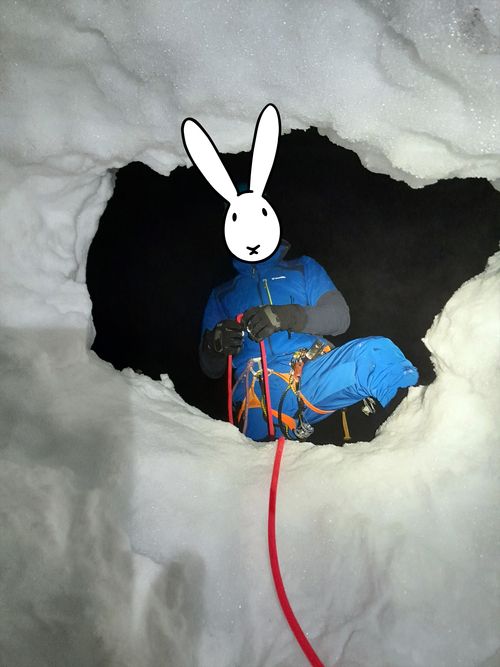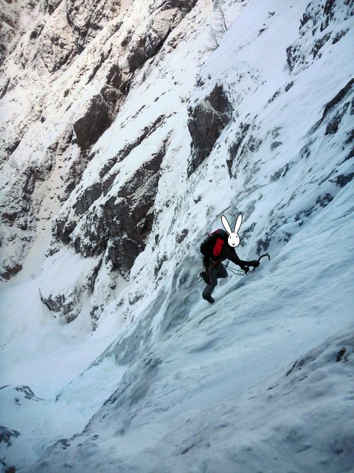 Konečně králíci stanou pod poslední velkou neznámou, kterou představuje Bandunterbrechung – v létě prý pěkná plotnovitá pětka. Ušáci však mají víc štěstí než rozumu, a tak je zde přesně tolik ledu, aby z ní byla WI3 paráda. Ke slovu přijde i ten jeden šroub, když už ho s sebou táhnou. Za chvíli Bobek štanduje pod serakem velikosti solidní činžovní vily. Čelby se ujímá Bob, v posledním světle vykomínuje na sněhové pole, aktivuje beast mode, jako kdyby měl vzteklinu, a jme se dupat gipflšluchtu. Nakrátko se ještě prostřídají, ale čumákem v čumák strmému sněhu a setrvalému spindriftu Bobek pochopí, kde je po zbytek dne jeho místo, a opět pustí dopředu našláplého druha. Ten kolem půl deváté zahlásí objev špičky oranžového bivakovacího kotce a vzápětí se vypne. Bobek tedy během půl hodiny pacičkami odhrabe vchod a vtáhne svého bezvládného kolegu dovnitř. V kotci je spousta erárního steliva. Králíci zhltnou kokošku, vyprázdní napáječku a padnou do bezvědomí.