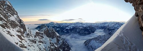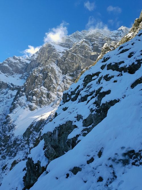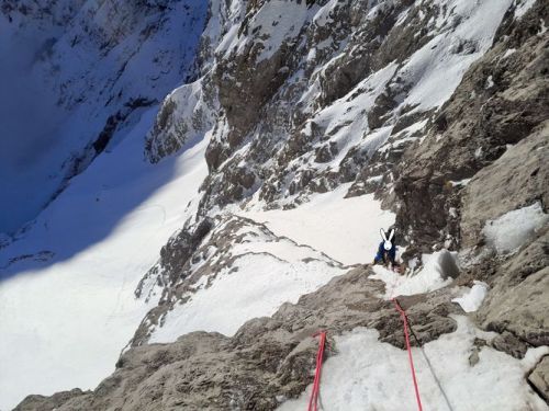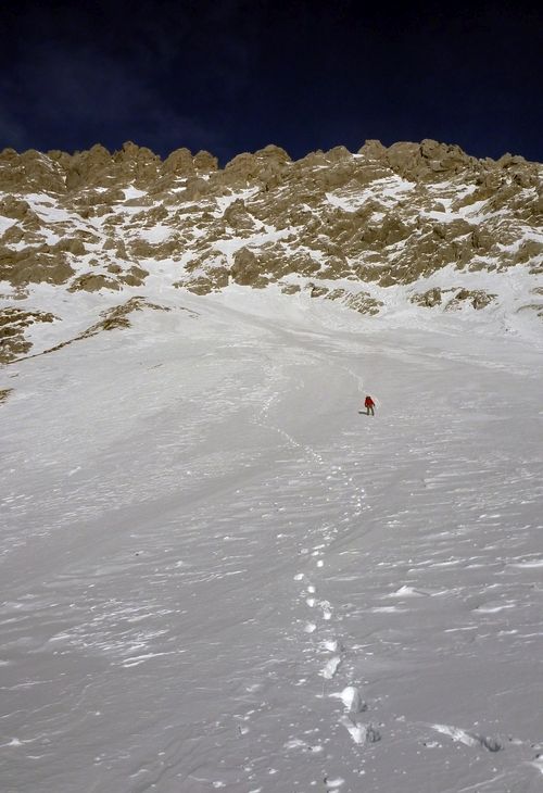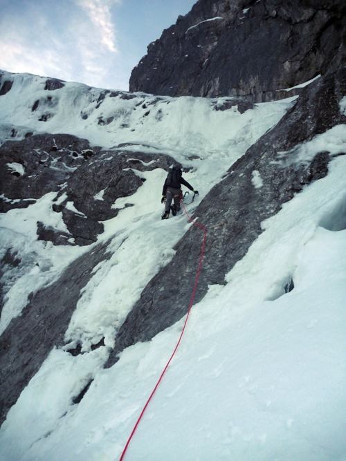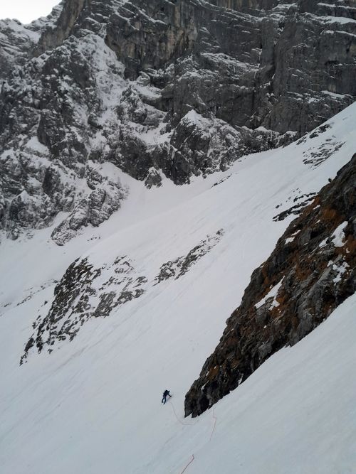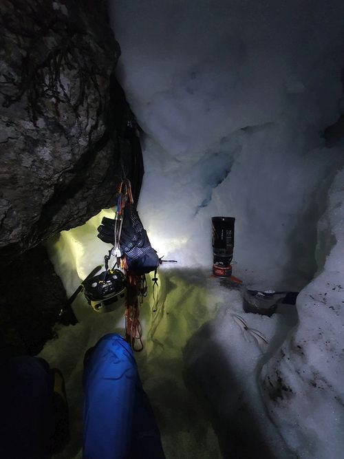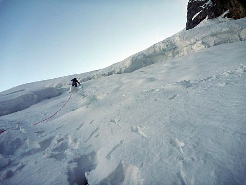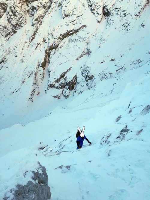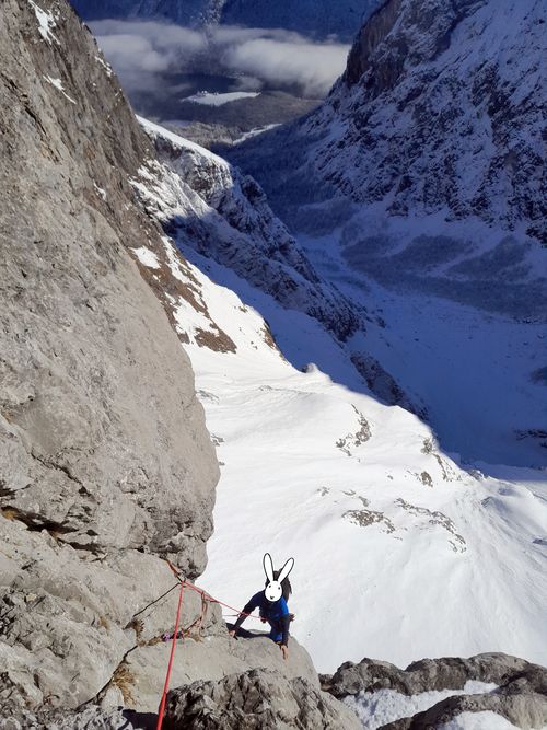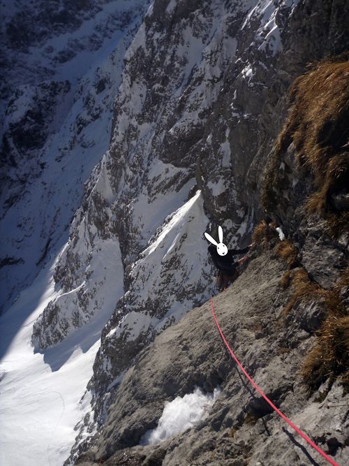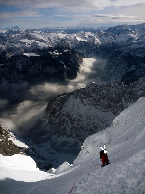 Při stoupání k Eiskapelle se oblačnost trhá, poprvé (a naposledy) lze vidět celou zeď. Start je jako z westernu – v pravé poledne se králíci přestrojí do lezeckého a vnoří do stěny. Prozatím každý sám za sebe. Na úvod snadné ledy, sněhové stráně, mixy do trojky, brodění sněhem. Postupně začíná být jasné, že se ušáci zadupali moc doprava. Na tři poměrně nepříjemné a obtížné délky vytáhnout lano, sem tam bludná skobka, potom nekonečně dlouhý traverz vlevo do Schöllhornkaru. Pomalu se šeří a králíci jsou lehce nervózní – zkuste taky najít bivakovací bloky v karu zvícím průměrné tatranské doliny, nota bene pod několika metry sněhu. Intuice nakonec nezklamala a povedlo se objevit skalky jen nesměle vystupující z bílé pláně. Bob zkoumá možnosti, jež nabízí odtrhovka v levé části, Bobek se mezitím – při snaze najít přijatelný koutek k vyprázdnění – propadá tři metry a následně z bílého hrobu nadšeně ohlašuje nález útulného pelechu o dispozicích 1+kk. Zbytek dne už je rutina. Přichystat podestýlku, pohltit granule a spát.