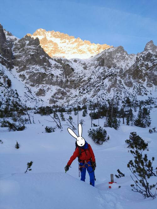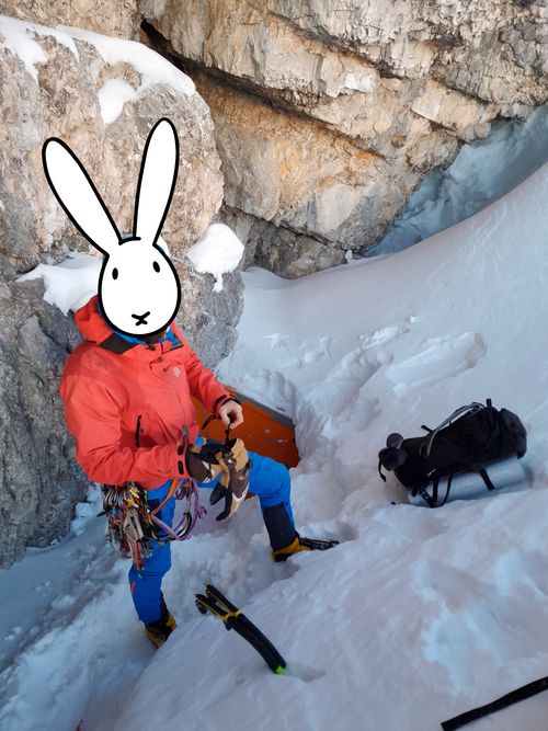 Ve čtvrtek tedy zatáhnout hrabání chodeb o trochu dřív, sednout do pojízdné králíkárny a následuje přesun ke Königovu jezeru. Ráno se po králičím způsobu nikam nespěchá. Pobalit nutnou výzbroj a výstroj na 3 dny. Singl padesátku a teglajnu na případný ústup, něco železa, jeden šroub, cepíny, mačky, bivakovací věci, zimní srst. Hlavně nepodcenit stravování - trávu radši ne, motá se po ní hlava, zato spoustu granulí a na chuť čokošku pastuší tobolku. Kdyby Bob s Bobkem nebyli zbytečně cimprlich a konzumovali primární trus, jako všichni pořádní příslušníci jejich rodu, šlo by váhu batohů ještě podstatně srazit. Inu, rezervy tu do příště jsou.