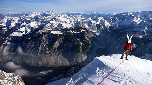 Ráno se ani jednomu z vyhřátého klobouku nechce, ale práce šlechtí. Na druhou stranu, kdo by chtěl bejt přešlechtěnej? Takže v osm se vykopat, obejít ostroh a hore háj! Kvalita sněhu se ještě zhoršila. Bob vyrazí dopředu, bohužel zcela chybným směrem. Vodorovný traverz vlevo ve visutém prašanu, dva peckery na délku – plyšáci touto slepou uličkou ztratí dvě hodiny. Návrat, identifikování správného (zavátého) komína a už se Bobek prokopává převějemi vzhůru. Občas se prostřídají a než bys řekl „myxomatóza“ pětsetkrát pozpátku, jsou pod závěrečnou stěnkou. Směr není jasný, skála je olepená sněhem, štand se nekoná a na všechny strany ďoura jak do pekla. Takhle tedy ne, přátelé. Králíci pomyslí na všechny vrhy mláďat, jež na ně doma čekají, a hledají alternativu. Tu najdou vlevo ve žlábku, který je interesantním mixem, delikátním ledem a hlubokým sněhem vyvede kolem druhé až k vrcholovému kříži se zvonečkem. Tomu se Bob s Bobkem ještě rádi pokloní. Ne snad, že by byli nějak nábožensky založení, ale na hřebeni je vichr jako prase, takže se jen s námahou udrží na nohou. To je ovšem poněkud na překážku původnímu plánu, který zahrnoval traverz Watzmannu přes Mittelspitze a Hocheck a kolem Watzmannhausu pohodlně k autu. Místo toho se králíci dlouho nerozhodují a utíkají po hřebeni směrem Südflanke, o které toho v zimních podmínkách moc známo není, ale i to málo zpráv dokáže nepotěšit. Co naplat, že je prý cesta značená, když barva není pod sněhem vidět.