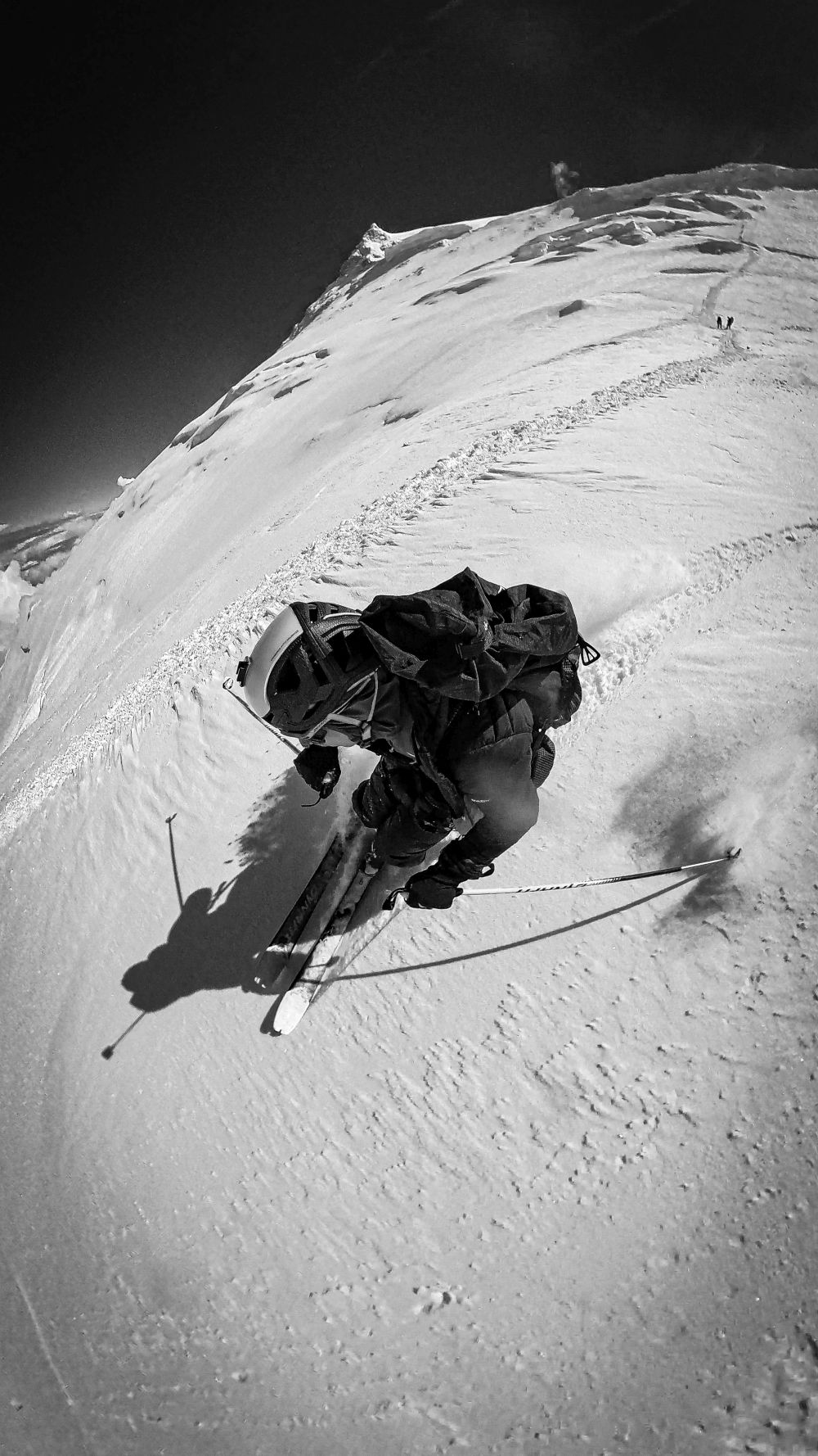 První oblouky letošní skialpové sezony budou z osmitisícovky. To nezní špatně! Sněhové podmínky z vrcholu po C4 se střídají v pořadí krusta – prašan – výfuky – led. V krustě lyžovat normálně zvládám, takže tady to přeci musí jít taky. Jízda je ale zprvu velmi toporná. Pak se to zlepší a je pouze toporná. Zlomená noha by tady znamenala fatální komplikace, to z hlavy prostě nevyženeš.