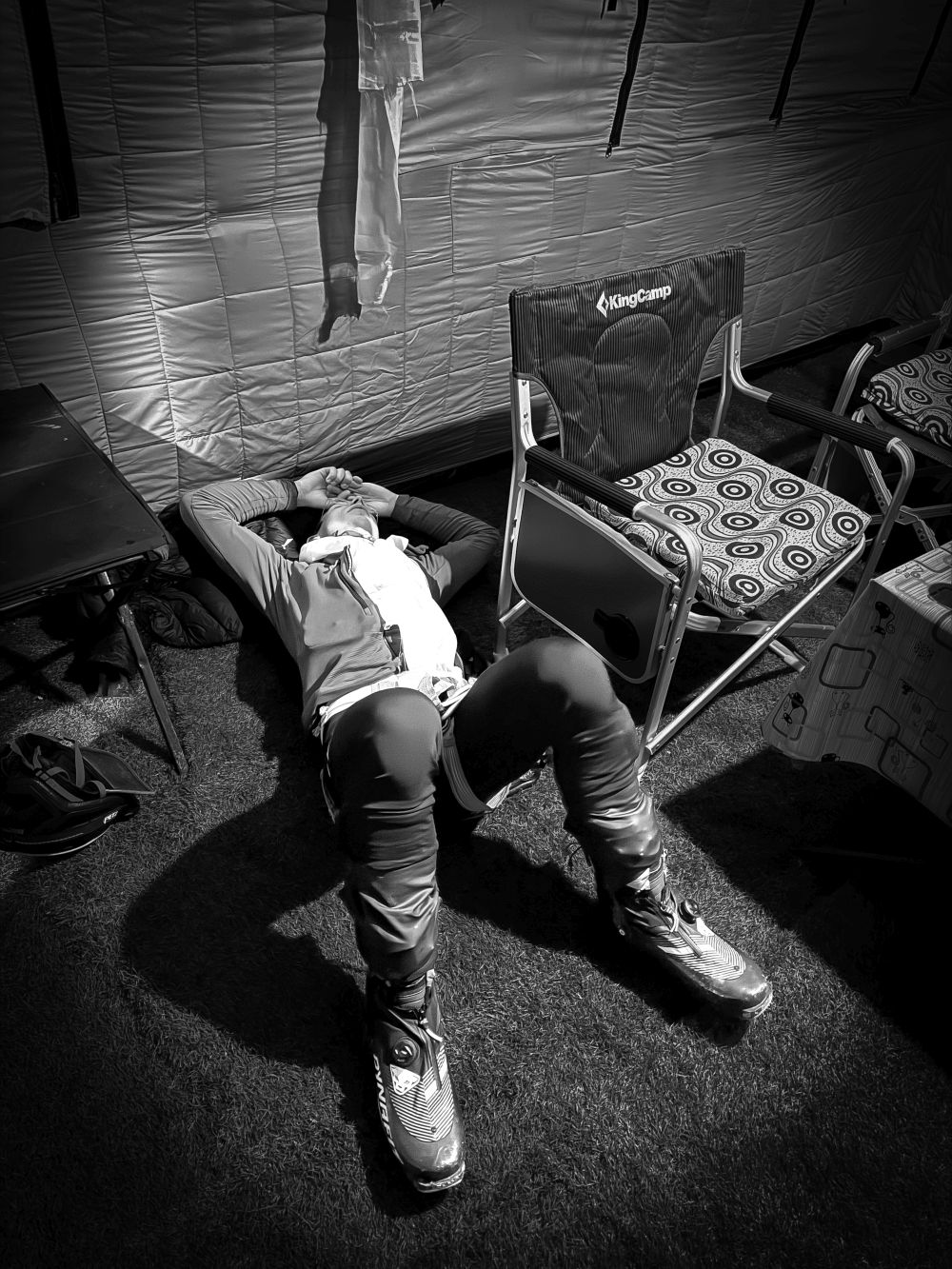 Konečně basecamp. Před čtyřiceti hodinami jsem odsud odcházel k vrcholu. Objímáme se s Ondrou, který na nás čekal, aby nám pomohl přemístit bagáž a naše tělesné schránky dolů do vesnice na vrtuli. Zařídil nám večeři, vyhřátý stan a sbalil nám dokonce i věci. Bez něj bychom to zvládli fakt těžko. Žádné velké oslavy nehrozí, v jídelním stanu padám na zem, kde v zápětí usínám, ještě v lyžácích. Jsem K.O.