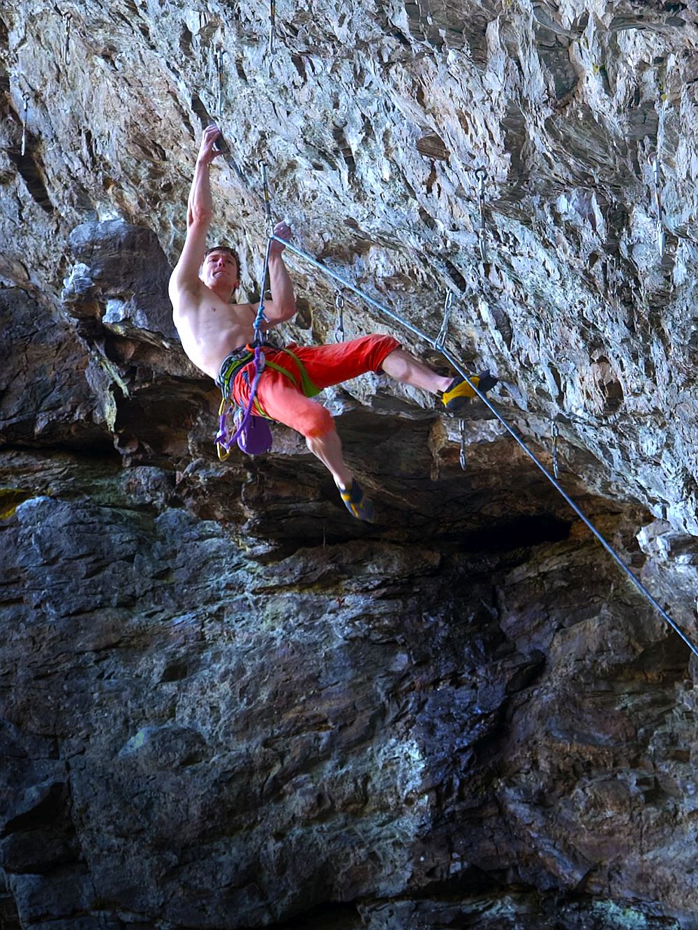 Radek Votoček, který má na kontě 14 cest za 8c+, z nichž polovinu přelezl za posledních devět měsíců, zopakoval cestu Senzace 9a (11 UIAA) od Adama Ondry na Krkavce u Semil.