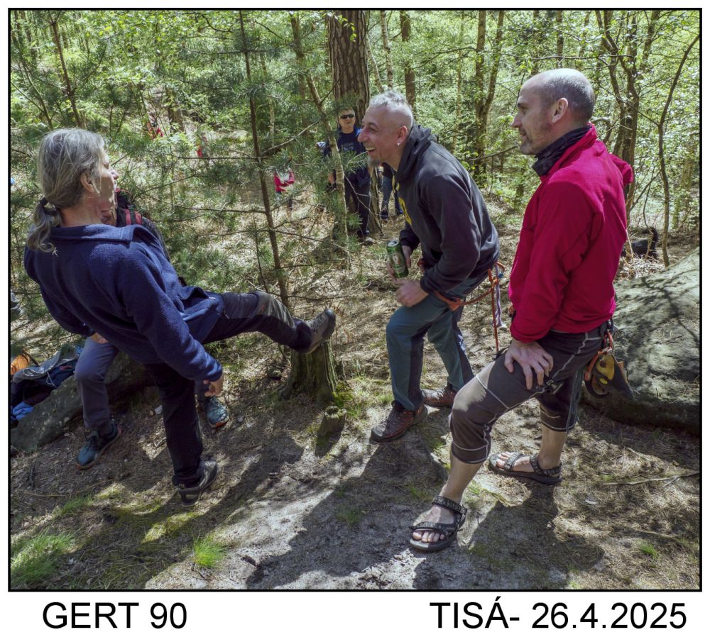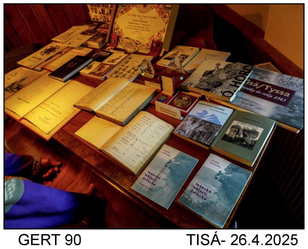 Gert má takové své moto, každý den jít do skal, jíst střídmě, ale dobře a lézt s mladými děvčaty. Na jedné fotce jsou jeho knihy a průvodci. Letos vydal dvě knihy, jednu o svém mládí v Jeníkově a druhou o lezení na písku.