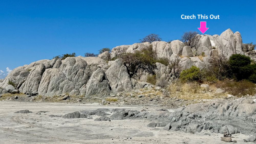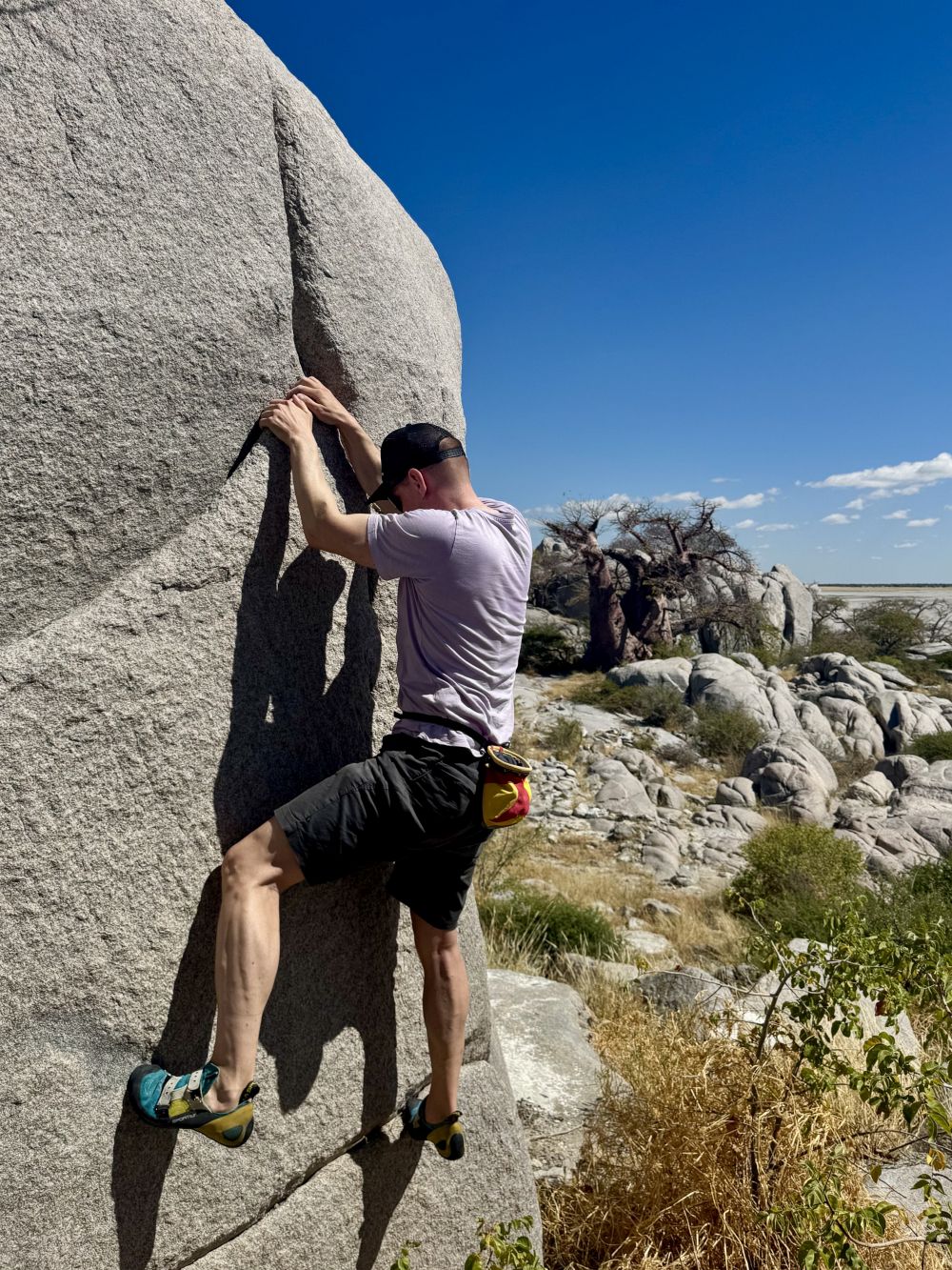 Popolézal jsem všude možně okolo. Polední slunce hřálo jako o závod, okolní vyschlé křoví šustilo v lehkém vánku a stíny všudypřítomných stoletých baobabů byly příliš daleko. Blízko u nejvyššího bodu ostrova jsem našel krásnou linii s jasným nástupem z horizontální spárky na nohy a oblou špicí na ruce, výšvihem a zvedačkou za oblý chyt na tření. Tuto cestu jsem pracovně nazval „Czech This Out“. Přístup k boulderu je znázorněn v přiložených fotkách. Říkejte tomu jak chcete, ale já si do své vrcholové knížky píšu prváč v Botswaně :)