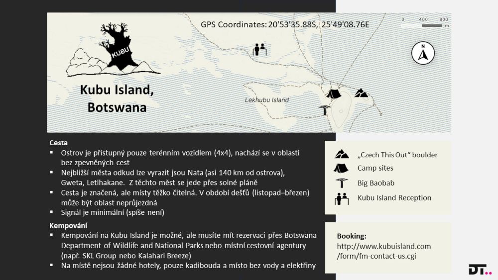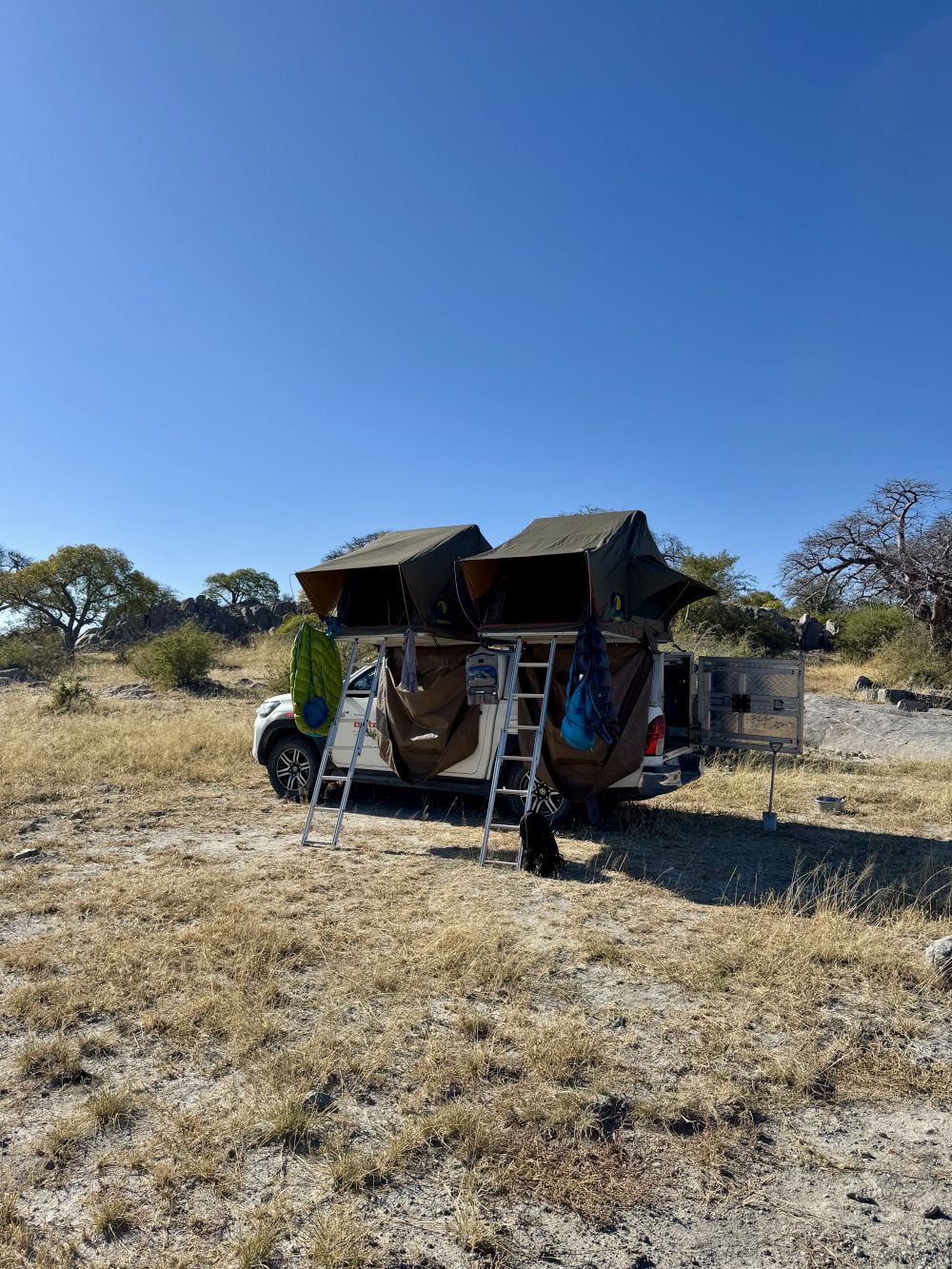 V Botswaně se tohle rozhodnutí ukázalo jako dobrý nápad. Půjčenou Toyotou Hilux se stany na střeše a s kompletní kempovací výbavou jsme ze severního města Kasane vyrazili na okružní cestu skrz zajímavá místa a národní parky Botswany. Jednou ze zastávek byl Kubu Island, skalnatý ostrůvek uprostřed suchých solných plání, posetý oblými žulovými balvany, prastarými baobaby a typickou pouštní vegetací. Krajina, která vypadá jako z jiné planety.
