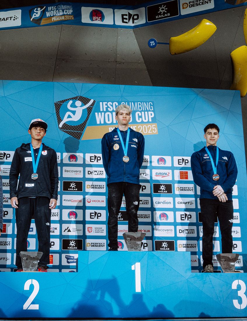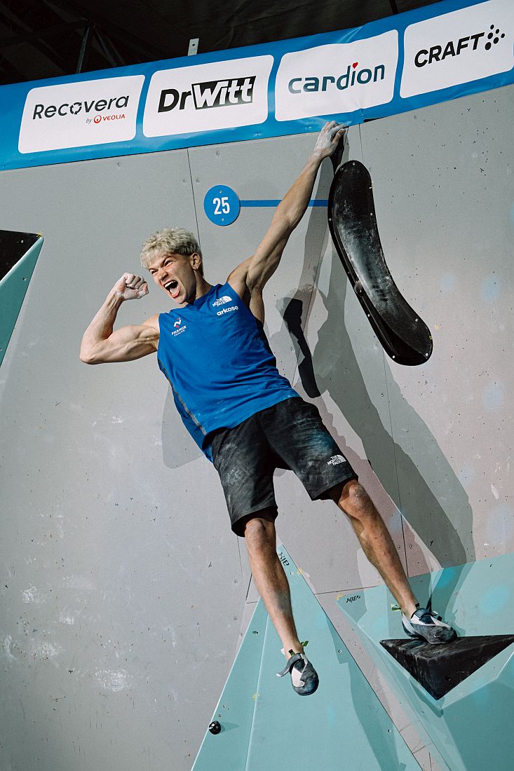 Francouz Mejdi Schalck vyhrál dnes večer finále pražského závodu světového poháru v boulderingu 2025. Druhý byl Japonec Sorato Anraku, třetí Francouz Samuel Richard.