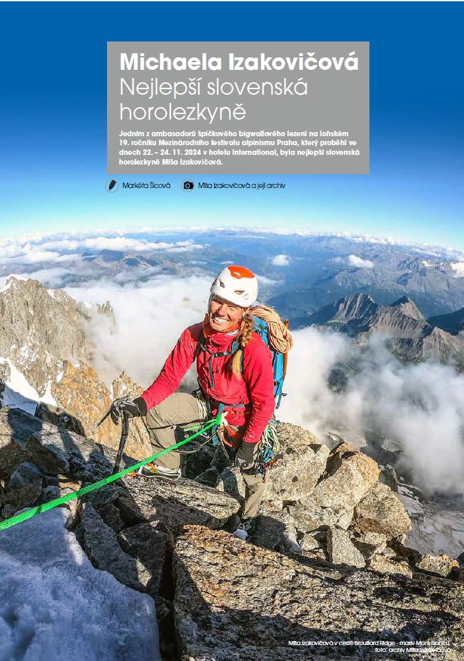 Michaela žije a trénuje v Adršpašských skalách a specializuje se na lezení velkých stěn. Od roku 2016 je členkou slovenské reprezentace v alpinismu. V posledních letech se vypracovala na nejlepší lezkyni slovenského horolezení. Byla šestou ženou na světě, která volně přelezla cestu Golden Gate na El Capitana v Yosemitech. Rozhovor najdete na str. 19-22.