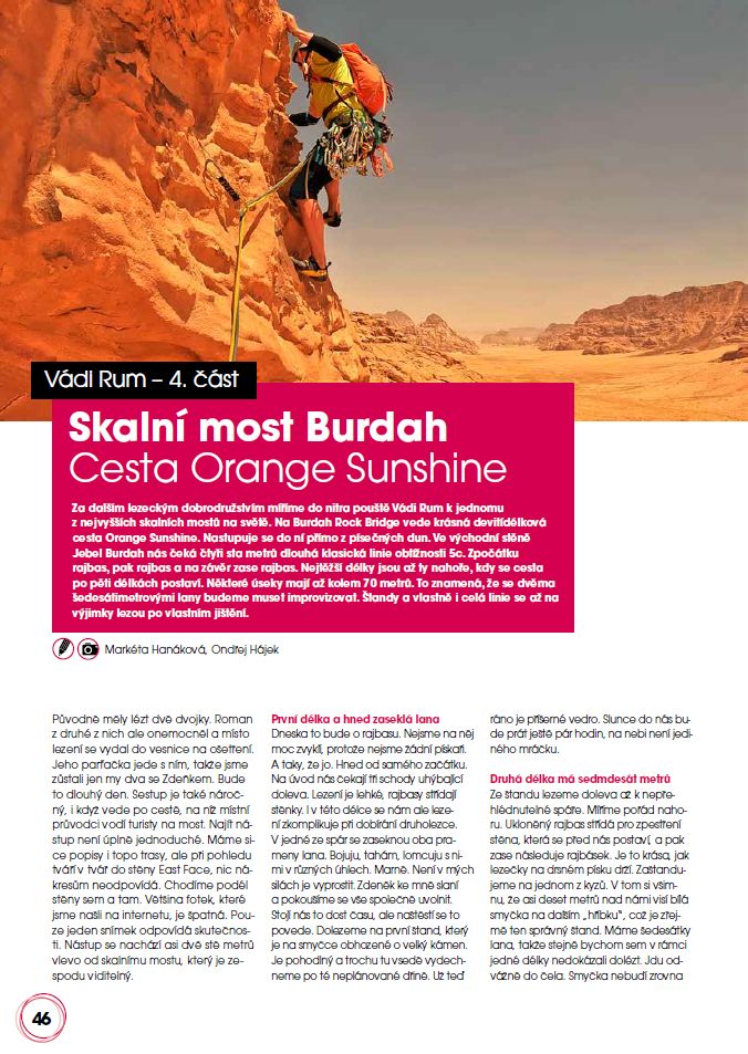 Již 4. díl o lezení v masivu Vádi Rum v jordánské poušti je o výstupu na unikátní skalní most Burdah Rock Bridge. Devítidélková cesta Orange Sunshine, která vede ve čtyřista metrů vysoké východní stěně Jebel Burdah, je jistě výzvou pro všechny milovníky lezení a mimořádných lezeckých dobrodružství. Vše na str. 46-51.
