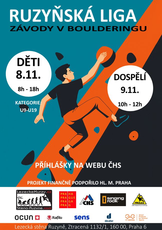 Lezecká stěna Ruzyně v Praze pořádá boulderové závody pro děti a dospělé.