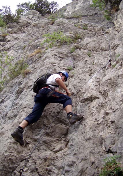 Ferratku jsem šla a vůbec si nemyslím, že bych byla fyzicky zdatná a zkušený horolezec nejsem už vůbec. Závratě mi dělají občas problémy. Ale vylézt tuhle stěnku nebyl problém ani bez dvou litrů vody. Faktem je, že jsem vyměkla a šla ji v lezečkách, ale můj spolulezec Láďa lezl celou dobu v "pantoflích" a taky přežil bez úhony. Jo a měli jsme na sobě jenom sedáky s odsedkou.