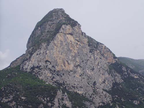 Trasa: Vlastně není potřeba ani mapa, vrchol vidíte nad sebou a jde se pořád po červených značkách do kopce. Možnost zabloudit je mizivá. Rozcestí pod kopcem je ještě jedno, doprava vás navádí na ferratu, doleva podél skály do vesničky Ranzo. Pod úpatím skály vás již bude vítat začátek zajištěné cesty a hezky začerstva rovnou kolmo nahoru. Cesta je udržovaná, nesetkáte se s žádnými rezavými lany či roztřepenými konci. Nicméně použití kožených rukavic je velice vhodné.