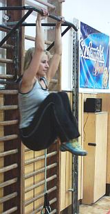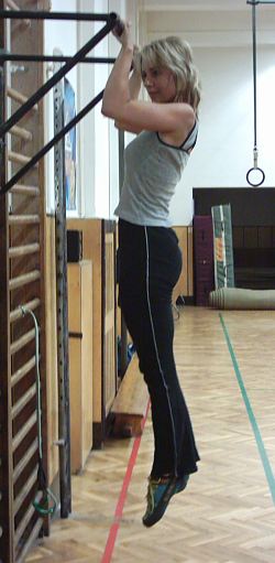 „psací stroj“ - ve shybu (brada nad hrazdou) střídavé přesouvání k pravé a levé ruce, čas a objem cvičení jako u statických visů