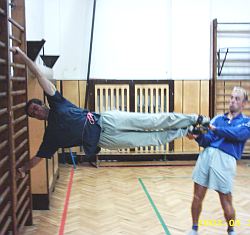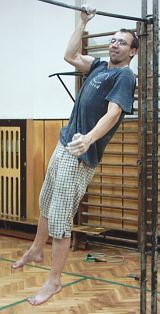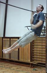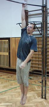 2 shyby obouruč na hrazdě a 5 s vis, úhel v předloktí 20° (poloha A), 2 shyby  a 5 s vis, úhel v předloktí 90° (poloha B), 2 shyby a vis 5 s, úhel v předloktí 120° (poloha C). Pro vyšší intenzitu možno použít závaží.Cvičte 5 sérií, odpočinek 3 minuty.