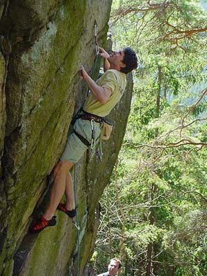Dandy - pokud jsi to ty z Obelixu, pak věz, že na tvůj popud jsme se vydali hledat ten věhlasný a "přísný" Kňafák. Pamětní desku jsme nenašli, kříž na Křížové skále je už jenom kůlem, skály jsou kompletně porostlé mechem a lišejníkem, pominu-li západní stěnu hlavní skály, a vůkol samé průseky a polomy. Jo a směrovka na Kňafák už taky neexistuje. Hotel zanikl a vlastní ho soukromá osoba. Moc by mě zajímalo, která je ta tvoje oblíbená spára, co tě někdy pustí a někdy ne. Na tu Hlavní skálu jsme vylezli čtyři cesty naslepo a docela jsme si mákli. Tak zatím čus a ať ti to hraje a leze!!!