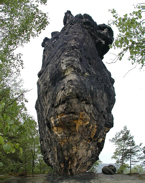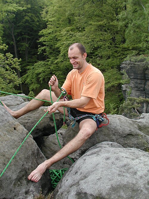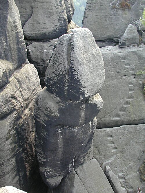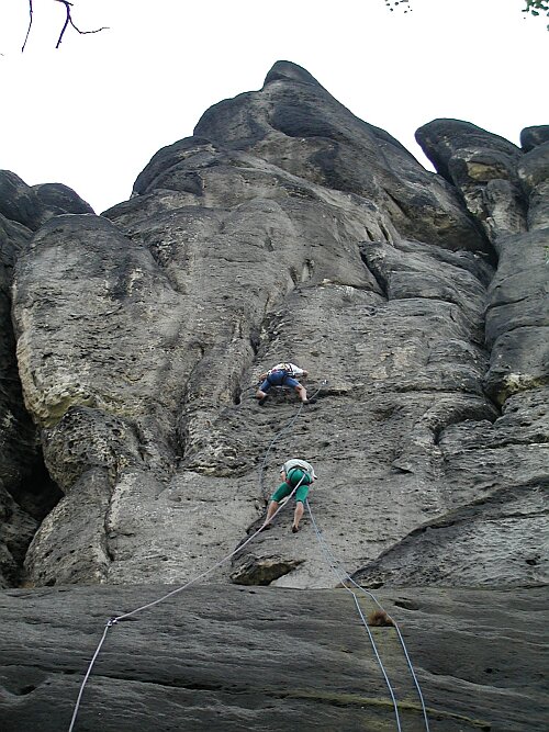 Ráno nás přivítalo mlhou z rozpařených lesů, které byly po delší době sucha a tepla zkropeny deštěm. I když v Sasku neplatí žádné pravidlo o počtu zakázaných hodin lezení po dešti, bylo jasné, že přinejmenším dopoledne je zabité. Plánovaný Blosstock musel být oželen a operativně byla přijata možnost přesunout se do Malého Zschandu o den dříve. Na Affensteinech jsme alespoň prošli pod stěnami Rokokoturmu, Brosinnadelu, Teufelspitze, Nonnengärtneru a Blosstocku. Pod posledním jsme se srazili se čtyřmi kolegy, kteří se k nám sice nepřipojili, ale věděli o nás. Později jsem se dozvěděl, že šlo o Víťu Nováka, který loni na Lezce napsal hezký článek o Sasku (byls to ty Víťo?).