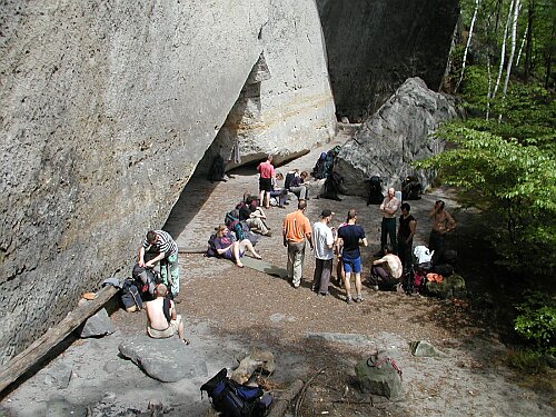 Na parkovišti jsme doplnili zásoby a vydali se směrem k Heringsteinu v Kleiner Zschandu. Kousek před ním u masivu po pravé straně jsme se definitivně usadili v bivaku tak obrovském, že by nás mohlo být třikrát tolik. Jeho největší předností bylo, že i přes nepřízeň počasí se v něm dalo společně posedět a dokonce se i procházet.