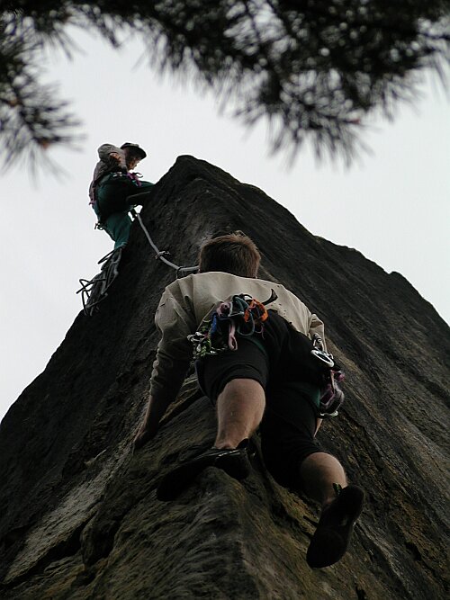 Večerní odjezd do Beuthenfallu v Kirnitzschtalu byl naplánován na půl šestou, ale protože žádný plán není dokonalý a všichni bytostně potřebovali lézt, odjížděli jsme až o hodinu později. Nic nás nehonilo a do bivaku u Wilder Kopfu na Affensteinech jsme dorazili za soumraku. První společný večer byl bohužel trochu pokažen počasím, protože se přihnala bouřka s deštěm a rozehnala nás pod různé převisy. Do jednoho bivaku jsme se nevešli, a nejen proto, že jsme se ještě o dvě hlavy rozrostli.