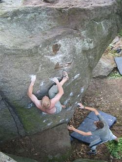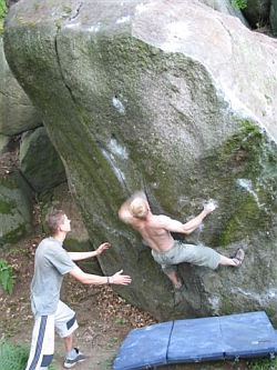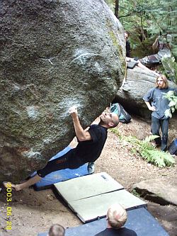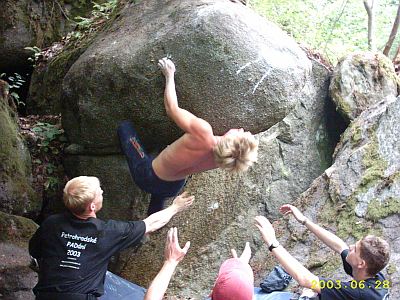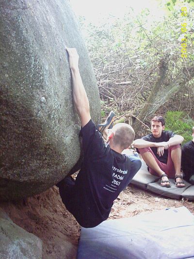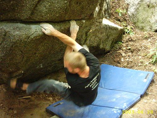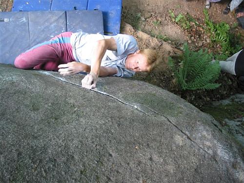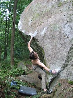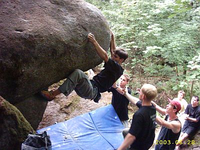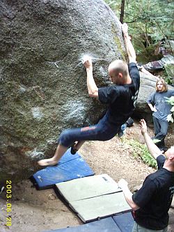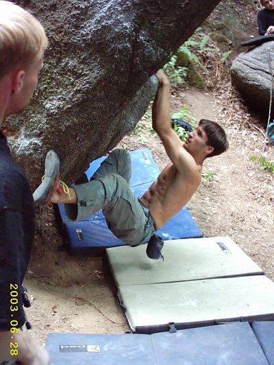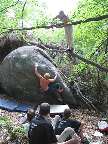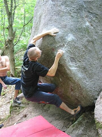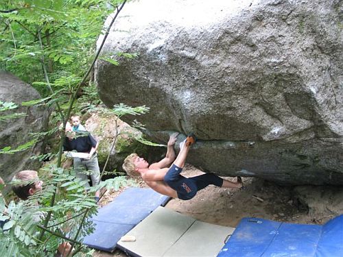 Jestli tady můžu prezentovat svůj názor, tak tedy musim říct, že to byly vesměs sakra těžké kousky. Po té co jsem si dal jedno 6A+ na rozlezení, jsem se málem dorakvil na jednom vysokém 6B+ a rozerval si na něm kůži. Aby ne, když jsem ho zkoušel nejmíň desetkrát.