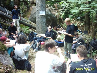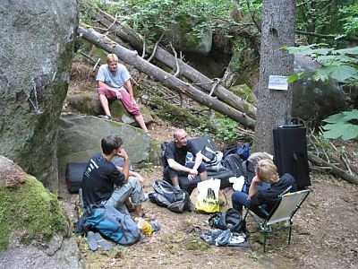 Když se shromáždil dostatečný počet závodníků, vyrazili jsme vstříc ke kamenům. Ještě že nebyl sraz až zde, těžko bychom to bez vedení Petra Reshe našli, a i ten měl trošku orientační problémy. V každém případě po deseti minutách jsme dorazili na Bránu, což je název této nové bouldrové lokality, kde závody proběhly. Petr Resch si neodpustil krátký ale důležitý proslov, provedl nás mezi jednotlivými kameny a cca v půl dvanácté odstartoval kvalifikaci.
