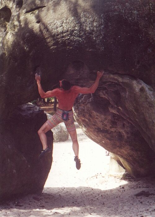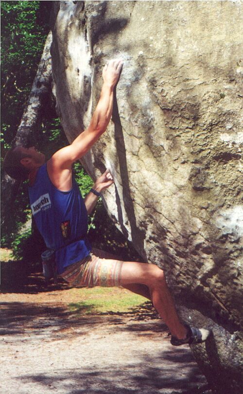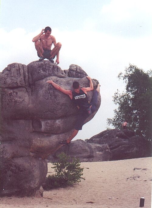 Odjížděl jsem plný rozporů. Koncem května, kdy i u nás se lezecká sezóna rozjela na plné pecky, odjet do tisíc kilometrů vzdálené oblasti?! Co tam budu na těch kamenech týden dělat?! Ale na druhou stranu Jarda Maršík nešetřil superlativy a pro rodinnou dovolenou se místo jevilo ideálně. Po noci strávené jízdou vautě jsme postavili stany na bezplatném tábořišti poblíž oblasti Bas Couvier, beznadějně obsazeném Holanďany, kteří zde trávili sváteční dny volna. Jen díky obětavosti Jardova otce, který pro nás vlastním tělem uchránil snad poslední dvě místečka, jsme se mohli zabydlet a ve skalách rozhýbat ztuhlá těla. Začali jsme opatrně na čtyřkách a pětkách a už tato obtížnost mě ukázala, že né vše půjde hned a že daný problém je třeba prokouknout, jinak se elegance a jednoduchost promění vurputný a upachtěný boj.Nutno říci, že už první den mi to chytlo. Kobereček na opucování lezaček, průvodce, shluk balvanů zúžasně pevného a tvarovaného pískovce sobílenými chyty a vy. A stálá otázka, jak se dostat nahoru, doprava nebo doleva. Průvodce je nezbytná součást výbavy. Kzakoupení je za 149 FRF například vtabáku vBarbizonu. Je téměř kompletní, vyjma posledních novinek a orientace vněm, ač na první pohled nepochopitelná, je následující: Na nákresu jsou očíslovány bouldry, za číslem bouldru je číslo a barva nakreslená na kameni a za ní a jménem je pochopitelně obtížnost. Já jsem to měl jednodušší. Měl jsem ssebou Jardu, který zde byl už potřetí a tak shledáním oblastí a pěkných cest se stačilo obrátit na něj.