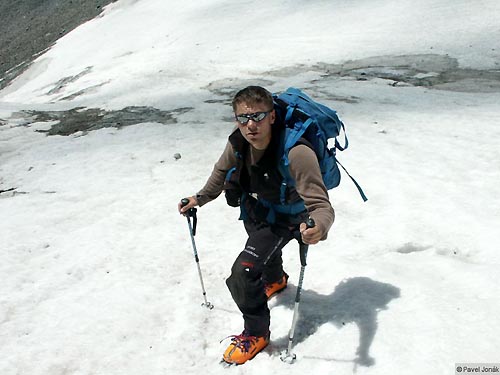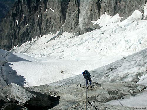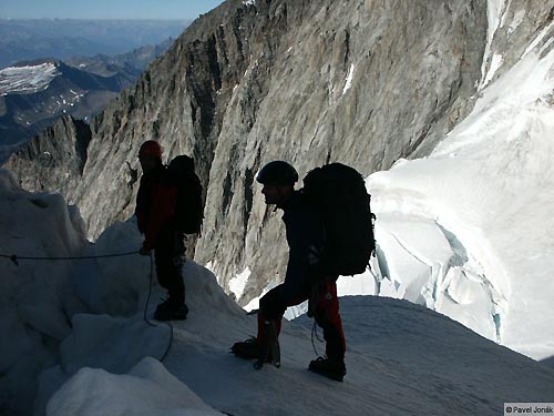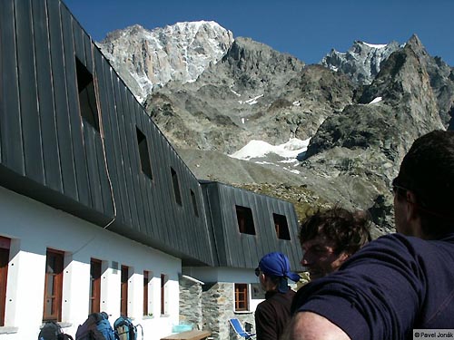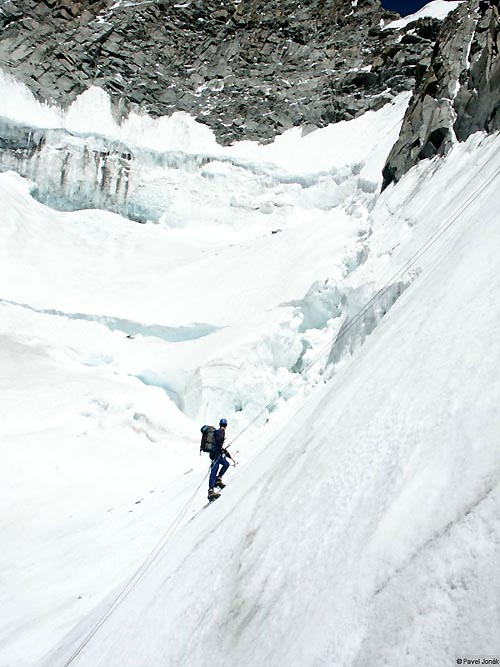 Přesto s údivem sledujeme následující tři dny, že naše batohy jsou o třídu větší a těžší než většina z těch, co se chystají podobným směrem jako my, patrně samí výletníci. Počasí se po několika dnech lepší a na chatě to houstne, vlci z údolí přicházejí s odhodlaným výrazem jeden po druhém a my nakonec přespáváme za 39 eur i s večeří, (slevy se nevedou) protože sháníme aktuální informace o přístupu pod Freney, a chatař co ví se vrací až k večeru. Všechny ledovce v Alpách jsou letos díky teplému počasí extrémně v pohybu a původní nástupy nemusí vůbec platit. Ráno vyrážíme do ledovce ještě ve stínu a kličkujeme mezi trhlinami na předních hrotech po nerozměklém ledu co to dá. Ledík vůbec nevypadá přátelsky a mám pocity jako bych dupal po zádech obrovskému krokodýlovi. Sklon a rozměry budí respekt a připomínají spíš fotky z Himalájí než z domácích Alp.