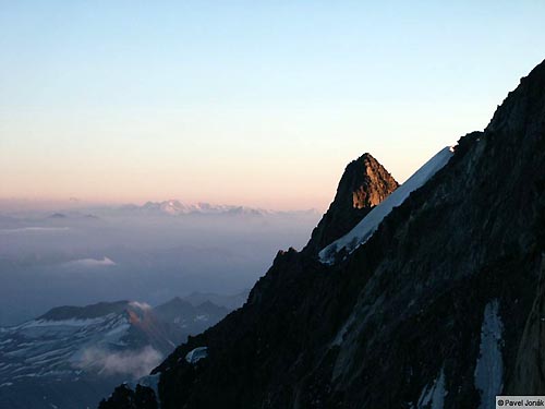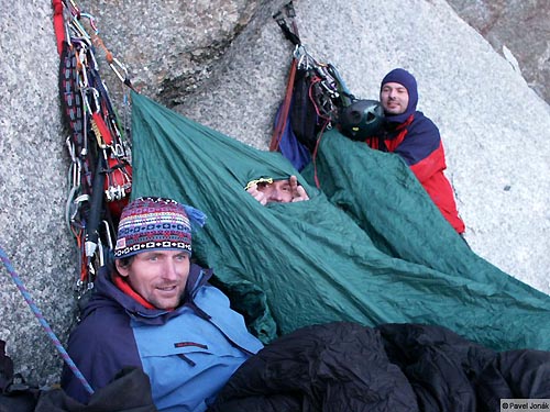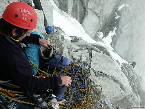 Dost depresivní je nástup do cesty dole rozbitým pilířem pod stálou palbou kamenů a ledu shora.Skála je tu odporná a vůbec nepřipomíná fotky betonové šamonické žuly z časopisů. Lezení není extrém, ale překáží nám batohy. Po sto metrech hrabání se nahoru a tahání batohů v mlze na polici se shodujeme, že směr moc krásy nepobral a že do zítřejší odpolední bouřky se v tomto duchu na vršek nemáme šanci dostat. Využíváme komfortní police a bez delších debat se shodujeme na biváčku schovaní pod převisem. Noc je i bez spacáků nezvykle teplá a při vaření vychutnáváme západ slunce.