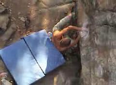 1. přelez se podařil Petrovi Reschovi. Na tomto snímku můžete shlédnout, kterak se o získání tohoto skalpu pokouší Azbest, Hynek a Martin. Azbestovi (www.climber.cz) se tento kousek zdolat podařilo a je také hlavním tvůrcem tohoto videa.