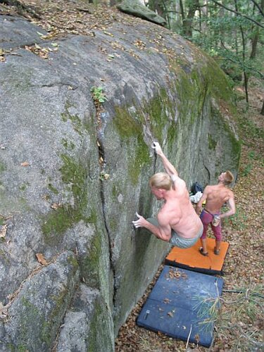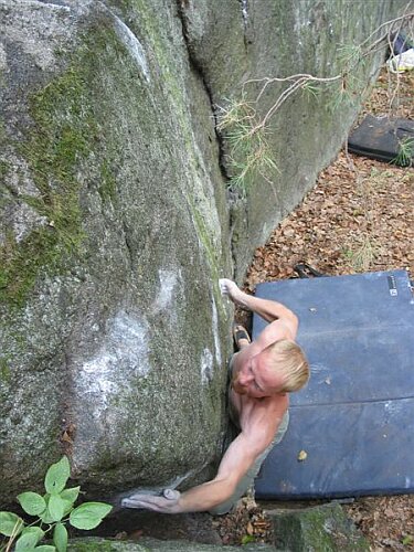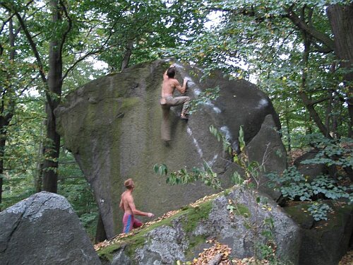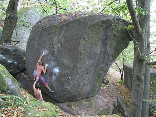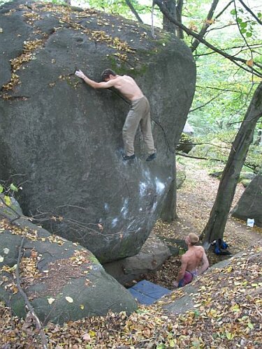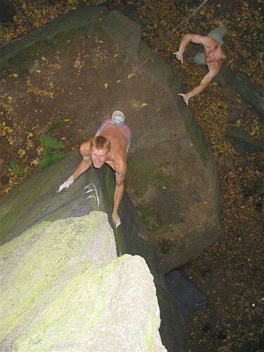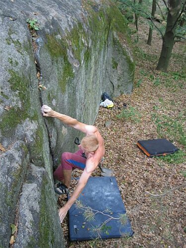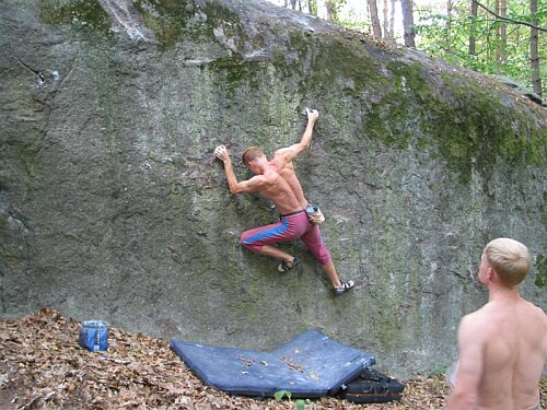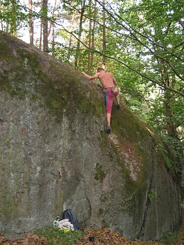 Podpořen rozumným klimatem, které vládne i v největších vedrech na Vyhlídkové skále (asi netřeba připomínat, že se jedná samozřejmě o Petrohrad), kde do stínu vysokých stromů profukuje větřík, který dělá posezení pod skálou tolik příjemným (ovšem bohužel jenom posezení) vytáhnul jsem Karla Hegra a bráchu Zdendu vytvořit několik nových věcí v oblasti, kterou už jsem považoval za vyčerpanou. Ona podpora přišla konkrétně minulý týden, kdy se mi podařilo dolézt zbytek nádherného traverzu „Bouře a vzdor“, který má teď přelezeny obě části zvlášť (viz registr boulderů – „Bouře 7C+ tr“, „Vzdor 7C+ tr“) a teď tedy čeká pouze na spojení. Takže tedy doufaje, že i v tomhle počasí se dá zaškodit jsme vyrazili s cíli Zdenda lézt šestky, Karel fotit a zbaštit nějakou tu Pizzu u Gábi a já zkusit celý traverz. Jak to dopadlo, posuďte sami.
