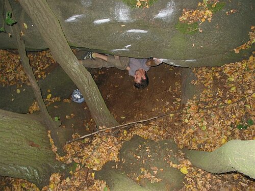 Pozor!!! Zcela nový a úžasný blok mezi Sekáčkem a Ementálem. Již dlouhou dobu lákající vklíněný balvan překvapil solidním nástupem ze stropu, který jasně umožňoval vylézt na obě strany. A tak vznikl Vytunel, směrem dolů vede „Svoboda 6A“, nahoru je „Snopková 6B“. Už jsme bohužel nestihli dát spojení obou nejen boulderů – „Libertu“, která nastupuje nahoře na balvanu, slézá „Svobodou“ a vylézá „Snopkovou“.