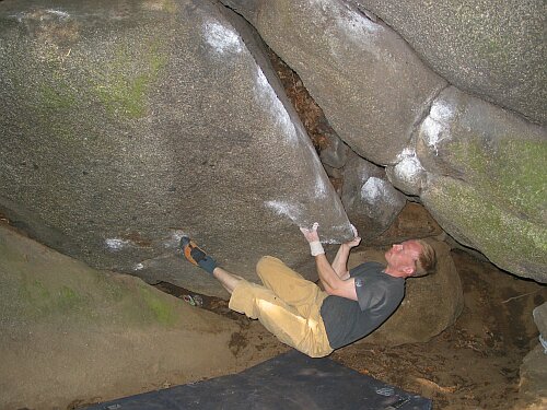 Začínám na Chatě. Zde je označen projektík po tupé hraně, který jsme do Petrohradského PADání šácli na 7B+, přelez však neměl. Asi pět pokusů a tahle oblá, překvapivě zajímavá záležitost padla... Kutil Tim, asi spíš 7C.