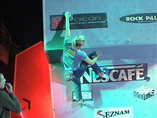 Hlavní aktérka, která se mimochodem stala vítězkou ženské kategorie těchto závodů, zde topuje druhý finálový boulder.