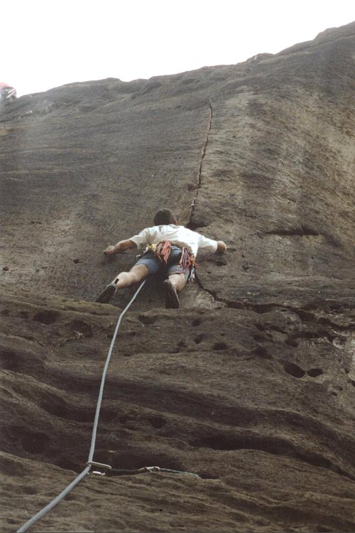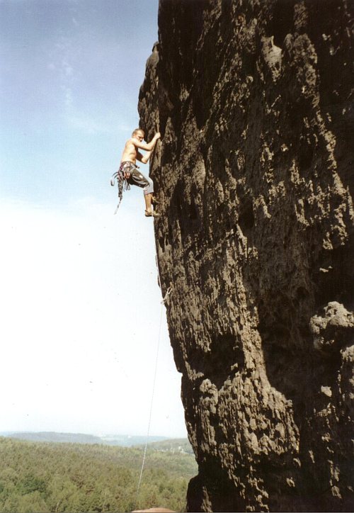 Degen IXb, RP IXc - super linie po hraně od nástupu Westwand přes 6 kruhů. Nesnadné lezení, občas za prstové dírky. Pevnější nervy si žádá zvláště dolez ke druhému kr. ( myslím ). Obtížnost roste s výškou a od pátého kruhu s rukou ve spárce a nohama kdesi pod sebou nezbývá než hrubě předpažit, šlapat vodu a pleskat rukama výše do oblých boulí. Závěrečné bříško kolem 6 kr. je také pěkně vypečené.