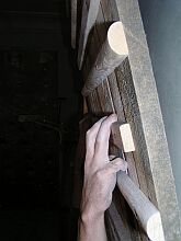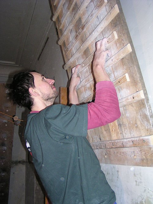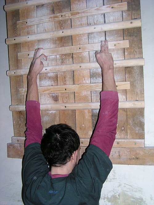 Nyní o lištách. Máte několik možností. Můžete zakoupit některou z posilovacích desek vyrobených ze stejného materiálu jako chyty na umělé stěny, kde je několik lišt o různé šířce. Nebo můžete nad dveře našroubovat několik vhodných umělých chytů či doma vyrobených dřevěných lišt. V tomto případě se osvědčilo mít nad dveřmi našroubovanou desku z překližky ze sítí otvorů se samořeznými matkami. Mezi deskou a zdí musí být prostor pro přečnívající šrouby. Výhodou této desky je méně děr a hmoždinek do zdi a snazší výměna chytů. Pro výkonnostní a vrcholové lezce je nejlepší mít doma Campus board, lištovou desku s pravidelně rozmístěnými a očíslovanými lištami (o cvičení na této desce příště). Pro prsty nejpříjemnějším materiálem je měkké dřevo. Šířka lišty by se měla pohybovat od 2 do 4 cm se zaobleným okrajem. Používají se i menší lišty, ale....