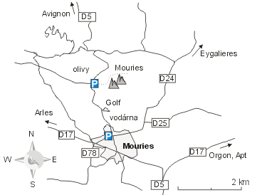 Asi tak 2 km severně od Mouries městečka, nejlepší přístup Route de Servanes, držet se směrem na Golf Servanes, kolem vodárny až k ostré zatáčce doleva před olivový háj. Zde doprava po prašné cestě a po 50 m zaparkovat pár kroků od prvních sektorů.