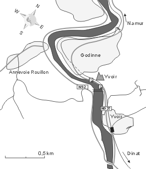 Z Namuru podél řeky až do Dave a směrem na Yvoir. Projedete Yvoir a zaparkujete za mohutným jezem s lávkou nad ním. Další parkoviště je několik set metrů dále.