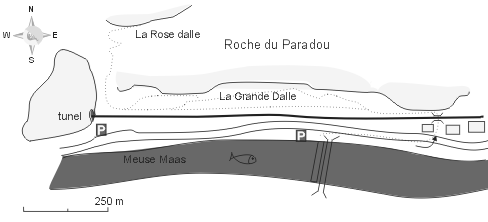 Oblast je skutečně velmi oblíbena pro velký počet lehkých cest a tak o slunných víkendech je zde dosti nabito. Zatím je pro návštěvu ještě brzy, ale plány je třeba udělat včas navíc Roches du Paradou není široko daleko jediným šutrem v okolí městečka Yvoir, protože skálu zde nejdete těměř na každém meandru řeky Maas, ale ne všude se leze, neboť pozemky pod skalami jsou velmi často soukromé a majitelé většinou lezeckým aktivitám nepřejí. Po tři čtvrtě dne jsme s Jonquelle lezli v 15 km vzdáleném Freyr a pak jsme se rozhodli, že se pojedeme na tyto skály, které nás upoutaly při našich častých průjezdech kolem, podívat.