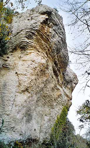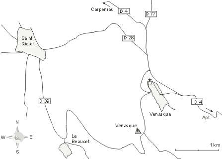 Na křižovatce pod vesnicí směrem na Le Beaucet (od křižovatky pod Venasque 1,6 km ke skalám zaparkovat na pravé straně pod nejvyšší stěnou - věží u jejíž paty stojí  rozpadlý domeček.
