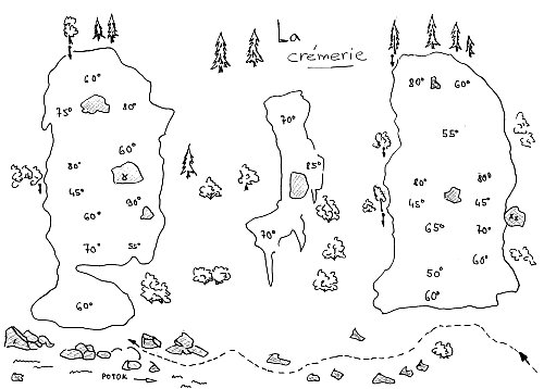 A: La Cremerie je oblast tvořena dvěma ledovými jazyky o délce asi 90 metru. Jejich sklon se pohybuje mezi 45-80 stupni. Sestup je slaněním po stranách ze stanovišť u keřů a stromů. Jedná se o poměrně snadné lezení vhodné pro rozcvičení. Její velkou nevýhodou je snadná dostupnost a malá obtížnost, proto je často přeplněná vůdci s klienty. Může se zde sejít i několik desítek lidí najednou, a pak se čekají  fronty a na hlavy padají spousty ledu.