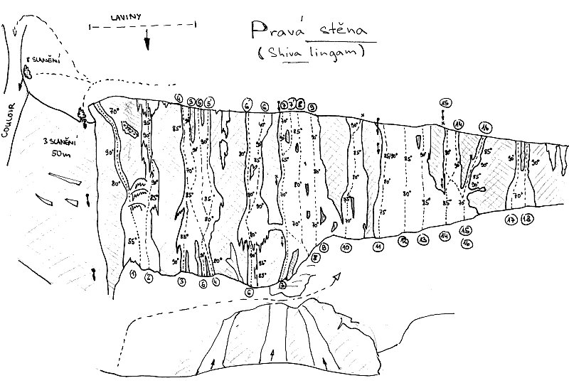 C: Shiva Lingam - nádherná oblast s největším počtem cest s délkou od 80 do 140 metru a obtížností WI 4 - 6, bohužel je nejdále z popsaných oblastí a navíc otočena k jihu. Na jaře je tedy třeba dát pozor, ledy bývají dost odtáté od stěny a často drží jen silou vůle (vaší).