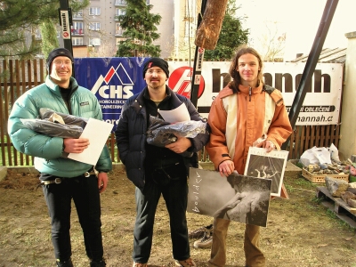 Včerejší SAUNA BOULDER 2004 je za námi a tak vzhůru na MOTYKA CUP. Pěkně jsme si to vymysleli. Po minulém ročníku, kdy závody s cepíny proběhly na boulderovce, to chtělo změnu. Pardálové s cepíny jsou přece otrlí a konformní podmínky boulderovek nejsou pro ně. Takže závody uděláme pěkně venku a možná bude i sníh a mráz. To je přece při lezení v ledu normální. Bude to mít tu správnou kulisu. No jo, ale teď je 12 nad nulou a poprchává. Ten mrak ze západu nevěstí nic dobrého. Už jsou tady Brňáci, nikdo jim neřekl, že tady prší a tak dojeli. Mrak přišel taky a tak prší. Jindra Zachariáš, jeden ze stavěčů, si to pochvaluje. Je samozřejmě jediný, komu se to líbí. Ostraváci jsou tady. Počasí nepočasí prostě přijeli už včera. Ještě John, Šéďa a Miloš. Tak to je vše. Celkem 8 závodníků. Padá mýtus, že všichni lezci s motykama jsou otrlý pardálové. O babách ani nemluvě.