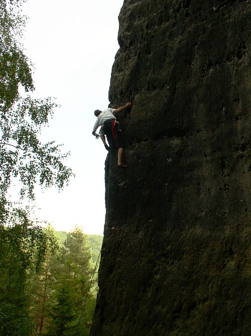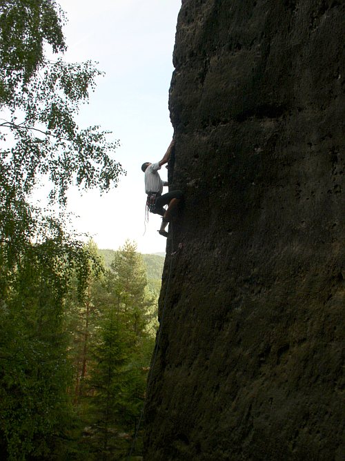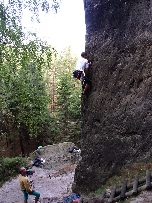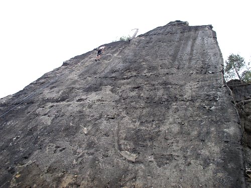 A když jsme u toho průvodce. Podle něj má ve stěně vést nalevo od hrany cesta Im Staub der Sterne RP Xc, jejímž autorem je Falk Heinicke a od stejného autora cesta Huskies RP Xb křižující Kleinkanadu. Po žádném z kruhů těchto cest není ani památky. Musely být vytlučeny a díry po nich umně zahlazeny. S podobným rozporem mezi realitou a průvodcem u cesty stejného autora jsem se již setkal i ve Schmilce. Jiné jeho cesty zůstaly a patří mezi ty pěkné a moderní. Co za tím zrušením stojí, nevím. Nejspíše porušení pravidel při prvovýstupu anebo to, že nová cesta už příliš zasahovala do té sousední. Zajímavé na tom ovšem je, že šéfredaktorem proslulého průvodce je Dietmar Heinicke a to už je starší pán tak asi ve věku otce Falka. Jestli je to tak nevím, natolik saskou lezeckou scénu neznám. Zjevně je na ní také živo.