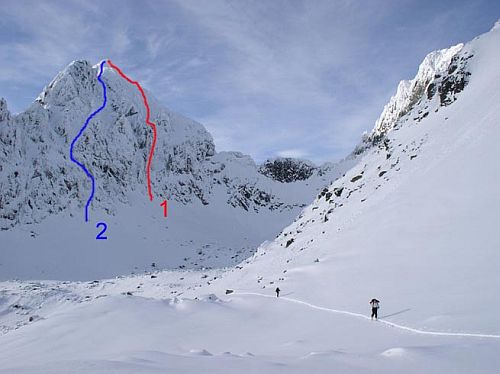 Vysoká zpod Kozí stráže, SV stěna (1 – cesta Dobruckých led III/3(IV), 2 – II-III)