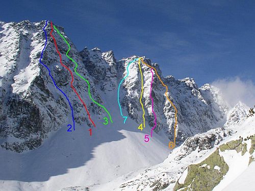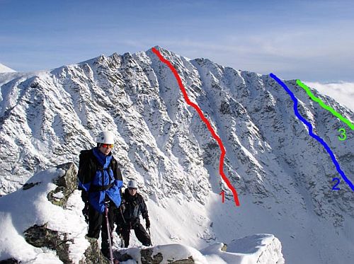 Na čtvrtý fotce je špatně zakreslenej nástup pod centrální žlab Vysoký (červená čára s číslem dva). Z popradskýho se nechodí přímo skrs dračí kotlinku alébrž normálně zlomiskama a pod ošarpancema nahoru. Jenom aby to někoho nespletlo. Jinak sou nákresy supr praktický.