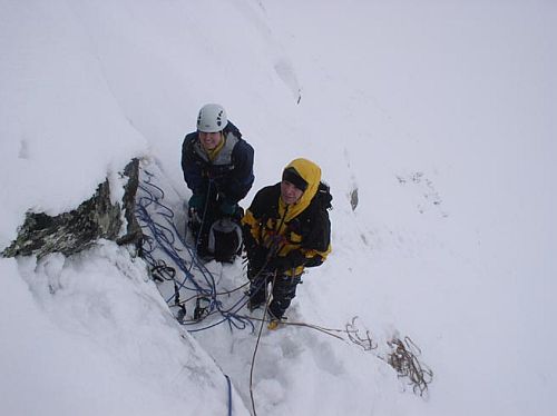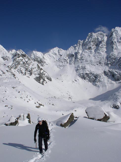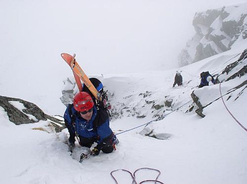 Ozajstný alpinismus na Zlomiskové veži. A ten žlábek pak na lyžích, škoda že nováčci to měli jen po zadku.