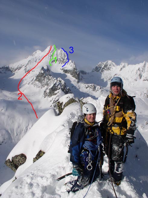 Katka a Jarek v dolezu třetího pilíře na Tupé. V pozadí Vysoká (1 – JZ pilíř na V vrchol II – IV, 2 – centrální žlab do 50 stupňů, 3 – hřeben Dračího štítu III – IV)